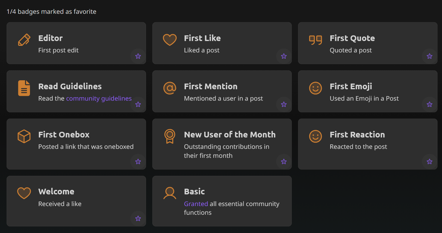 “Mark as favourite” for badges doesn’t seem to work well. I clicked on one 3 times, the icon didn’t change, refreshed the page, it shows one is selected but the icons are the same, and in my profile it doesn’t become the first or highlighted in any visible way. Although maybe the account status always comes first? I’m just not sure it worked as intended. :D