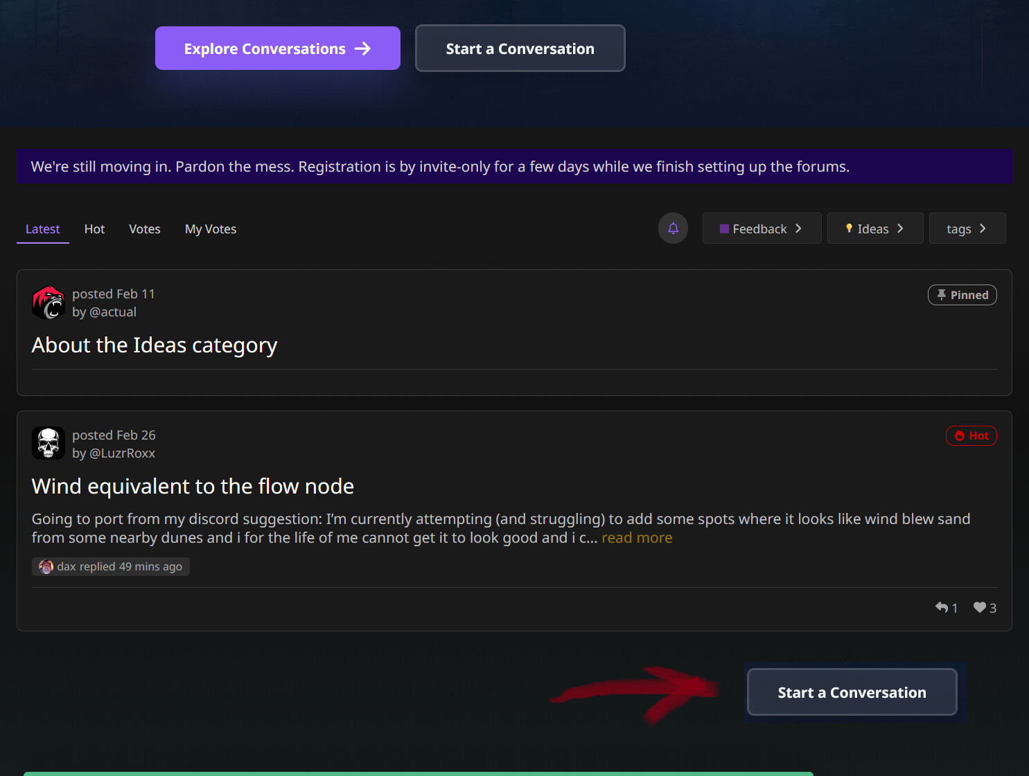 “Start a topic” button for the section you’re in. It kind of feels missing under the posts. Of course there’s a big “Start a conversation” button on top, but if you click it, it doesn’t automatically pick the category for your new post and you have to navigate to it manually. Personally, for me it would be more convenient to be able to have that context of the forum branch at hand, so to speak.